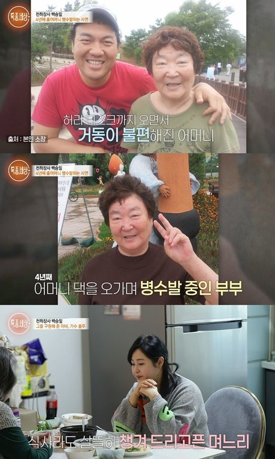 백승일은 "순간적으로 뇌경색이 오셔서 병원에 누워 계시는데 이미 입까지 마비가 되고 발음이 안 되는 상태더라. 몸의 우측도 아예 못 쓰는 모습을 보는데 피가 거꾸로 솟는 기분"이라며 허리 디스크까지 온 어머니를 4년 째 병수발 중인 근황을 전했다.