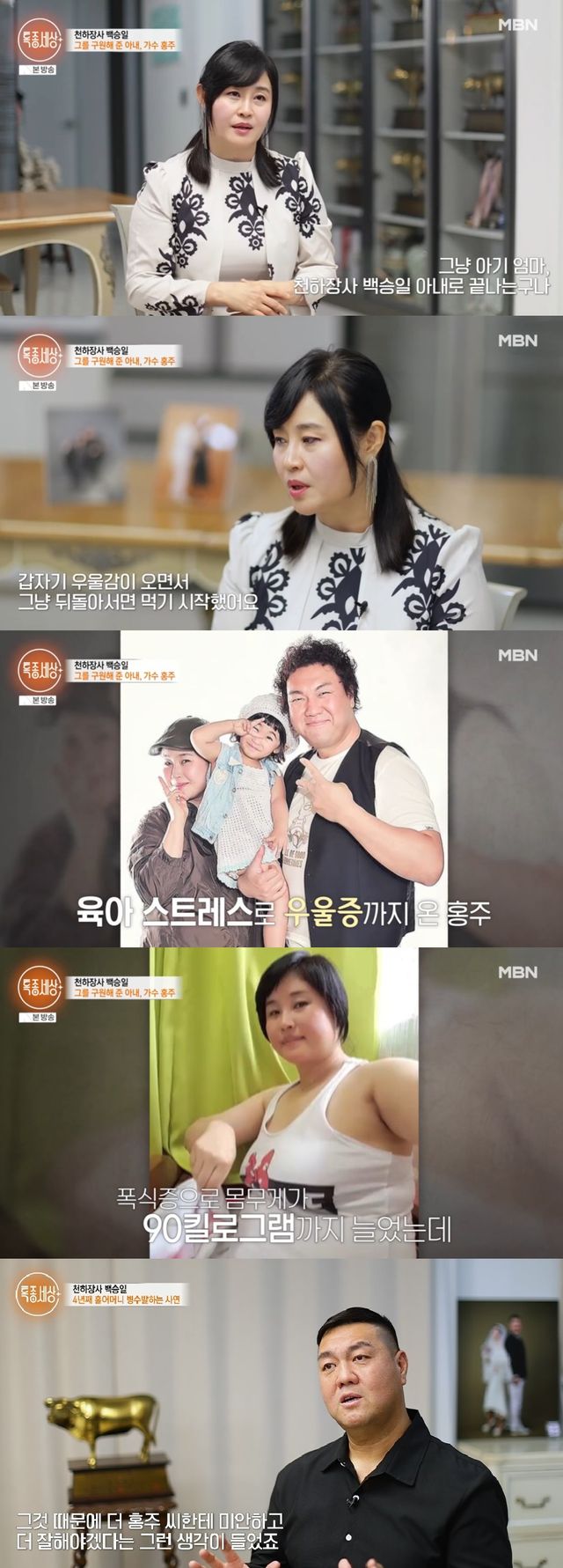 홍주는 "그냥 아기 엄마, 천하장사 백승일 아내로 끝나는구나 싶었다. 말을 안 하고 꾹꾹 담으려니까 우울감이 엄청 오더라. 갑자기 우울감이 오면서 뒤돌아서면 먹기 시작했다"고 고백했다.
