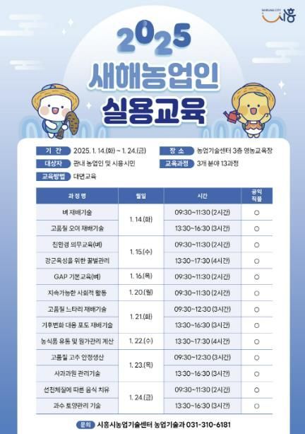 [와이뉴스] 시흥시는 1월 14일부터 24일까지 관내 농업인과 농업에 관심 있는 시민을 대상으로 ‘2025년 새해 농업인 실용 교육’을 농업기술센터 3층 영농교육장에서 진행한다.