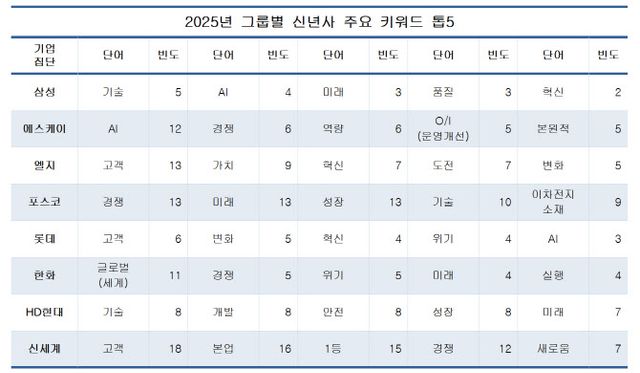 이어 ‘미래’(35회), ‘성장’(32회), ‘혁신’(31회) 등으로 언급이 많았다. 경영 리스크 극복을 위해 기술(27회)을 키워드로 꼽은 기업도 많았다. 포스코 10회, HD현대 8회, 삼성 5회 등의 순이었다.
