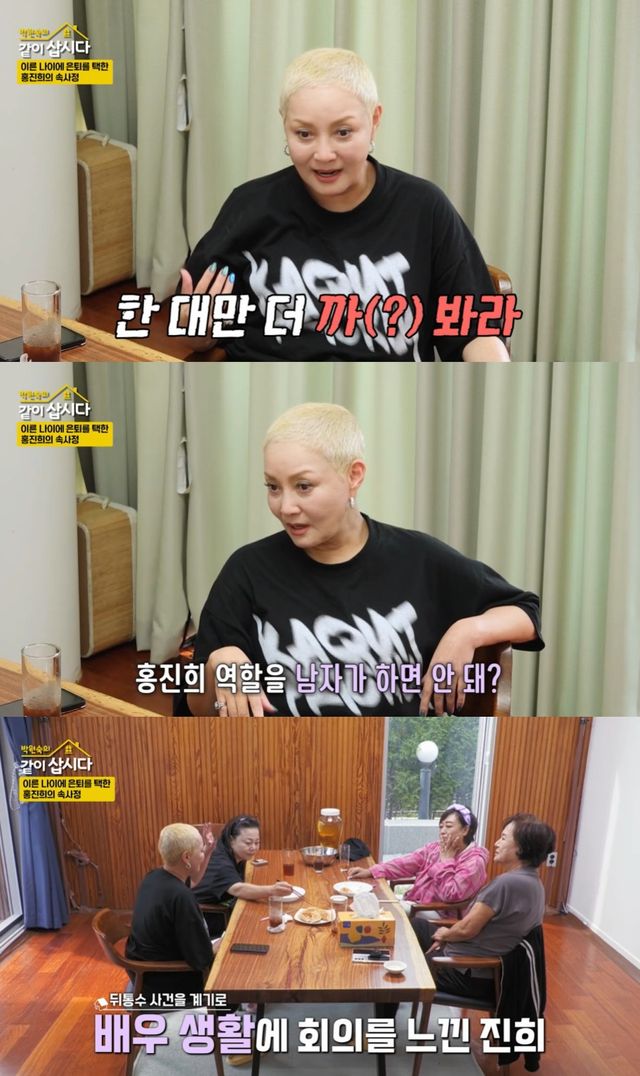 이날 홍진희는 "난 왜 진희가 굳이 은퇴라는 말을 했나 싶다"라는 혜은이의 질문에 "식당에 갔는데 방송 관계자들이 쭉 있었다. 제일 높은 분이 있어서 나 보고 한 잔 하라고 부르더라"라며 운을 뗐다.