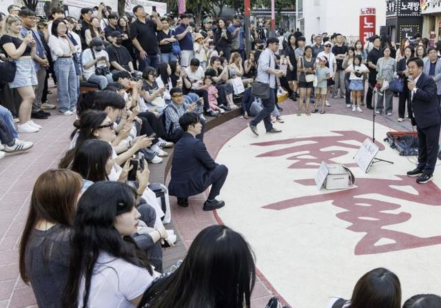 | ▲ 박강수 구청장(오른쪽)이 레드로드를 찾은 관광객들과 소통하고 있다. |