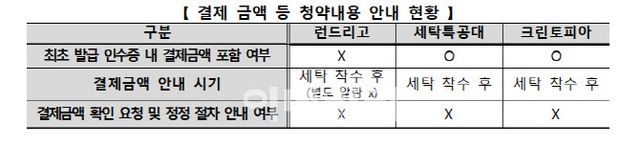 아울러 전자상거래법에 따라 사업자는 계약 전 소비자가 결제 예정 금액 등 정확한 청약내용을 확인하거나 바로잡을 수 있는 절차를 마련해야 하지만, 3개 사업자 모두 세탁물 검수 후 산정되는 결제 금액에 대해 소비자에게 미리 알림을 보내거나 정정 절차를 안내하고 있지 않았다.