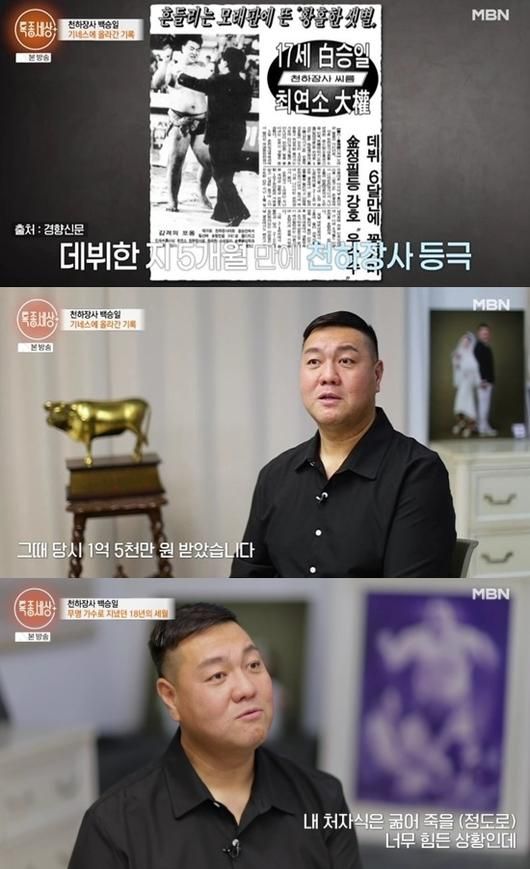 2일 방송된 MBN '특종세상'에서는 17세에 최연소 천하장사가 되며 씨름계를 평정했던 백승일의 근황이 공개됐다. 화려했던 씨름 선수 시절을 뒤로하고 가수의 꿈을 꾸며 새로운 도전을 시작한 백승일은 20년 가까이 무명 생활을 겪으며 많은 어려움을 겪었던 사실을 고백했다.