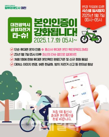 이장우 대전시장은 “대전 타슈의 이용률은 전국 최고 수준으로 지속적인 타슈 확충을 통해 시민들의 수요를 충족시키고, 대전을 일류 자전거 도시로 만들겠다”면서 “시민들도 이번 타슈 본인인증 절차 완료 후 타슈를 소중하게 이용해 주기를 바란다”고 당부했다.