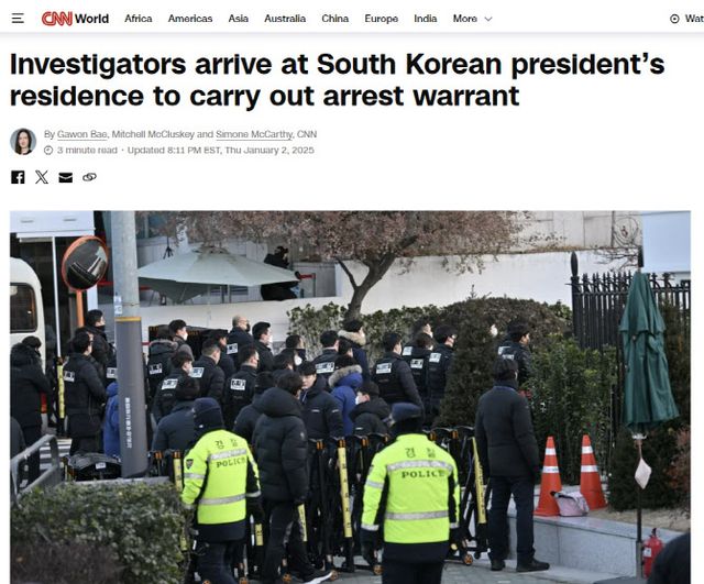 미국 CNN방송은 3일 “법원이 윤 대통령에 대한 체포영장을 승인함에 따라 공수처가 이날 오전 영장 집행을 시작했지만, 윤 대통령 관저에 대기중이던 경호처가 막아서면서 대치 상황이 이어지고 있다. 한국에서 현직 대통령을 상대로 하는 체포영장 집행은 이번이 처음”이라며 “윤 대통령의 경호팀은 영장 집행과 관련해 적법 절차에 따라 보안 조치를 취할 것이라고 밝히고 있다. 수사당국과 윤 대통령의 대립이 심화하고 있다”고 보도했다.