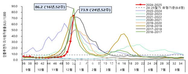 예년 인플루엔자 유행 정점 때의 의사환자 분율과 비교해보면 2016년 86.2명 이후 최고 수준이다. △2024년 73.9명 △2023년 61.3명 △2022년 60.7명이었다. 코로나19로 독감 유행이 없던 2020년과 2021년엔 각각 3.3명, 4.8명이 최고치였다.