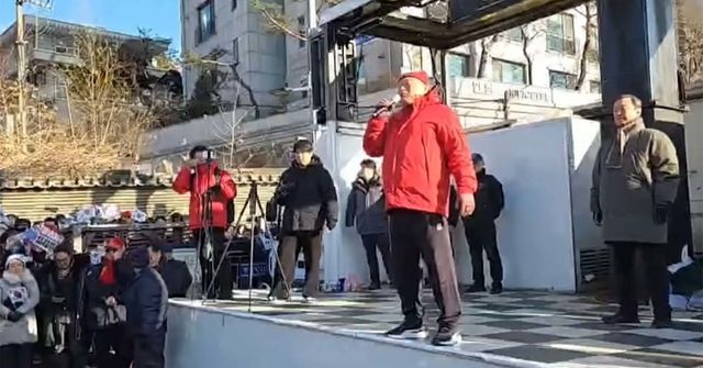 가수 김흥국이 2일 대통령 관저 인근에서 열린 보수단체 집회에 참석해 윤석열 대통령 체포를 저지해달라고 당부하고 있다. / 국민계엄 유튜브 영상 캡처