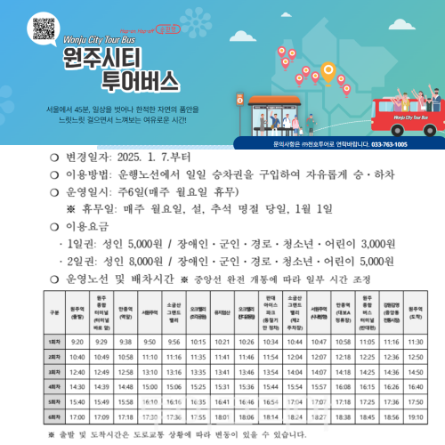 [투어코리아=정하성 기자] 원주시는 주요 관광지와 전통시장을 순회하는 순환형 시티투어 버스 운행 시간을 오는 7일(화)부터 변경한다.