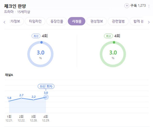 지난달 21일 첫 방송을 시작한 '체크인 한양'은 같은 달 29일 방송된 4회에서 전국 평균 3.0%의 시청률을 기록하며 자체 최고 시청률을 경신했다. 분당 최고 시청률은 전국과 수도권 모두에서 3.9%까지 치솟았다. 이는 역대 채널A 토일드라마 중 최고 시청률에 해당하는 수치다.