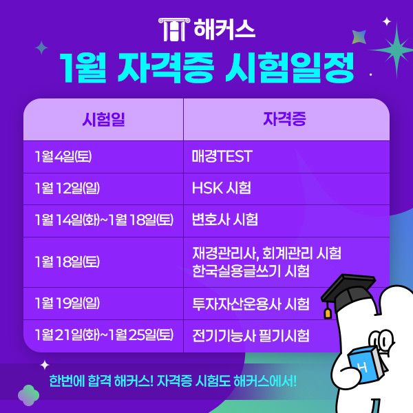 어학, 유학 시험 강의부터 취업, 편입, 자격증, 전문 자격증까지 다양한 교육 콘텐츠를 제공하는 해커스 교육그룹이 2025년 새해를 맞아 1월 자격증 시험일정 정보를 공개했다.