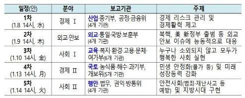올해 업무보고는 △대내외 리스크 관리 △취약계층 지원 △민생안정 △미래 성장동력 강화 △안전사회 구현 등 5개 주제로 나눠 진행된다. 우리 경제와 사회가 당면한 현안 위주로 각 부처 장·차관의 보고, 토의 형식으로 이뤄질 예정이다.