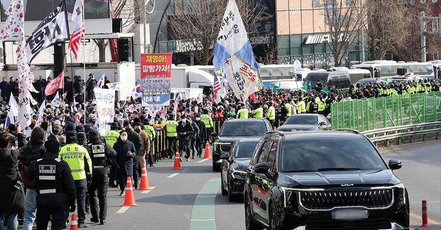 고위공직자범죄수사처(공수처)가 윤석열 대통령에 대한 체포영장 집행을 경호처의 저지에 중지한 3일 공수처 수사 관계자를 태운 차량이 관저를 나서 지지자들 옆을 지나고 있다. / 뉴스1