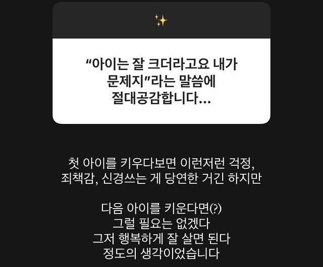 이어 "첫 아이를 키우다보면 이런저런 걱정, 죄책감, 신경쓰는 게 당연한 거긴 하지만 다음 아이를 키운다면 그럴 필요는 없겠다, 그저 행복하게 잘 살면 된다 정도의 생각이었다"고 덧붙였다.