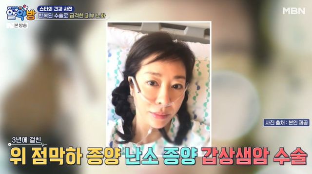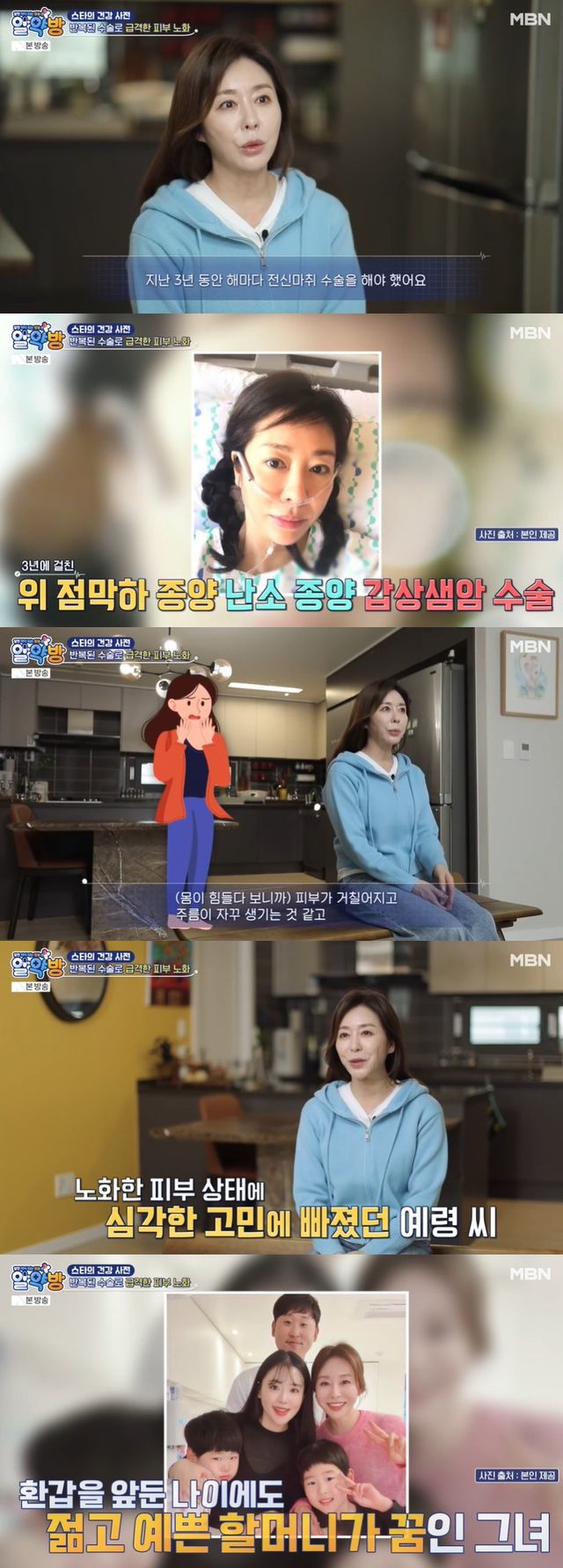 김예령은 "지난 3년동안 1년에 한번씩 전신마취 수술을 하게 됐다"라며 위 점막하 종양을 비롯해 난소 종양, 갑상샘암 수술을 겪었다고 고백했다.