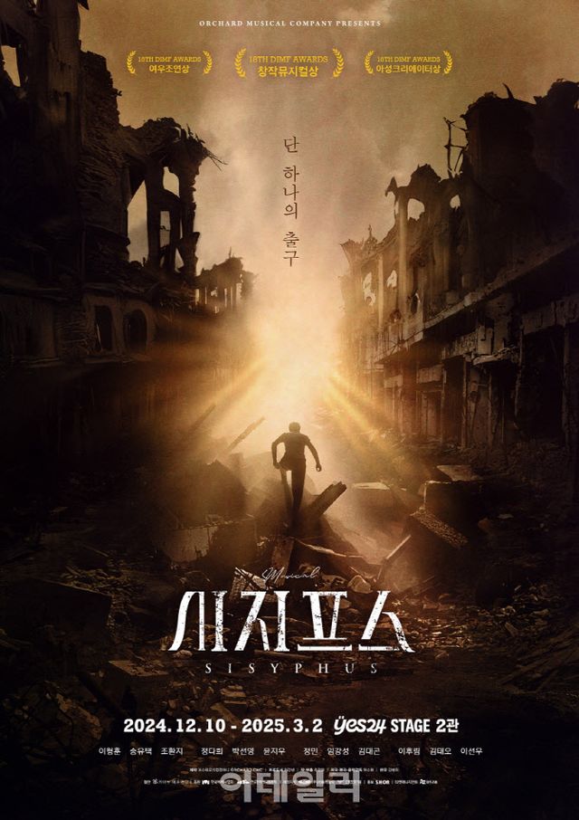‘시지프스’는 알베르 카뮈의 ‘이방인’을 그리스 신화 속 시지프스와 엮어 뮤지컬적으로 풀어낸 작품이다. 희망이라곤 전혀 남아 있지 않은 무너져 버린 세상에 버려진 청년 배우 4명이 ‘이방인’을 공연하면서 삶을 다시 살아갈 힘을 얻게 되는 이야기를 그린다.