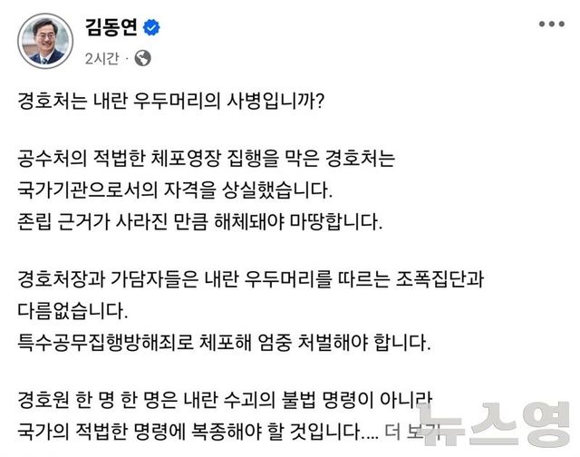 김 지사는 “경호원 한 명 한 명은 내란 수괴의 불법 명령이 아니라 국가의 적법한 명령에 복종해야 할 것”이라고 말했다.
