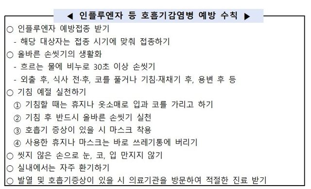 또 “외출 전후 손씻기, 기침예절 실천, 호흡기 증상 발생 시 마스크 착용, 집합시설 등 밀폐된 공간의 경우 2시간마다 10분 이상 실내 환기 등 기본적인 호흡기감염병 예방 수칙을 지켜달라”고 당부했다.