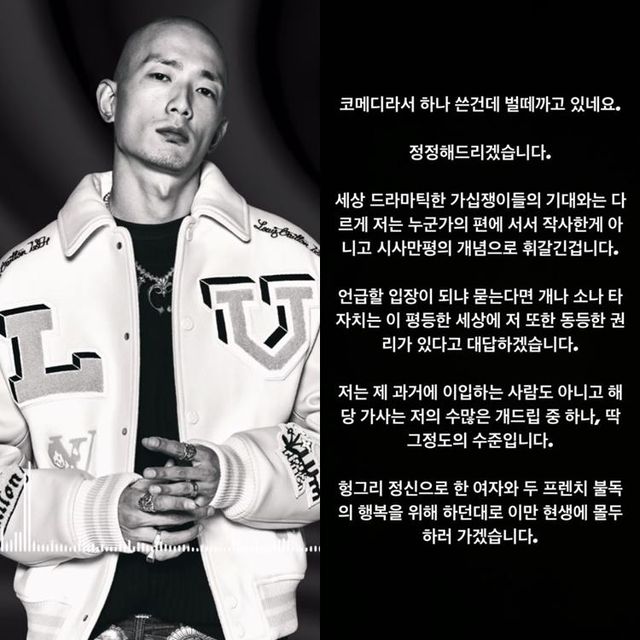 이어 “저는 제 과거에 이입하는 사람도 아니고 해당 가사는 저의 수많은 개드립 중 하나, 딱 그정도의 수준이다. 헝그리 정신으로 한 여자와 두 프렌치 불독의 행복을 위해 하던대로 현생에 몰두하러 가겠다”라고 덧붙였다.