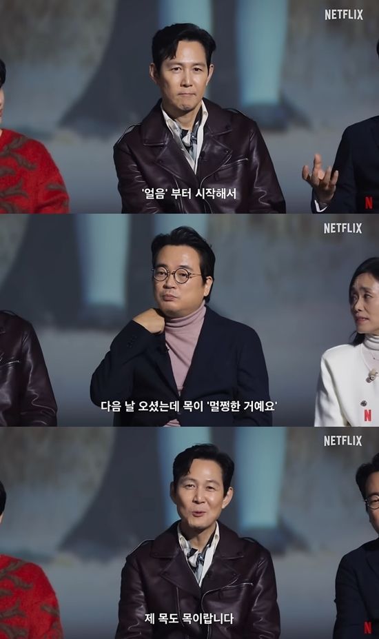 이에 이정재는 "아프다. 제 목도 목이다"라며 너스레를 떨었다. '무궁화 꽃이 피었습니다' 게임이 마무리 된 후 그는 "기훈이 이 게임에서 살아남아서 다음 게임에서 또 어떻게 사람을 살리려고 할까? 그리고 이 게임을 만든 사람과의 갈등이 어디까지 증폭될까? 생각하게 되는 장면"이라며 소감을 전했다.
