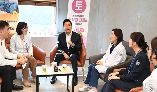 | ▲ 3일(금) 오전 '서울의료원 가임센터'를 찾은 오세훈 서울시장이 가임센터 직원들과 대화를 나누고 있다. |