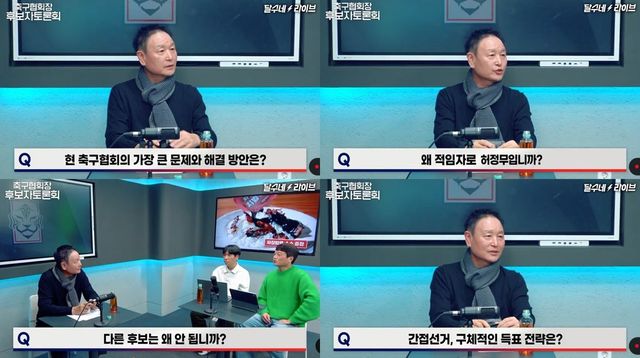 지난 3일 오후 7시 박문성 축구 해설가의 유튜브 채널 ‘달수네라이브’에서 ‘축구협회장 후보자토론회’에 나선 허정무 후보는 우선 현재 선거 운영 주체인 ‘선거운영위원회’에 대해 “누군지도 모르고, 몇 명인지도 모른다. 또 무슨 일을 하는지도 불분명하다”라고 다시 한 번 지적했다.