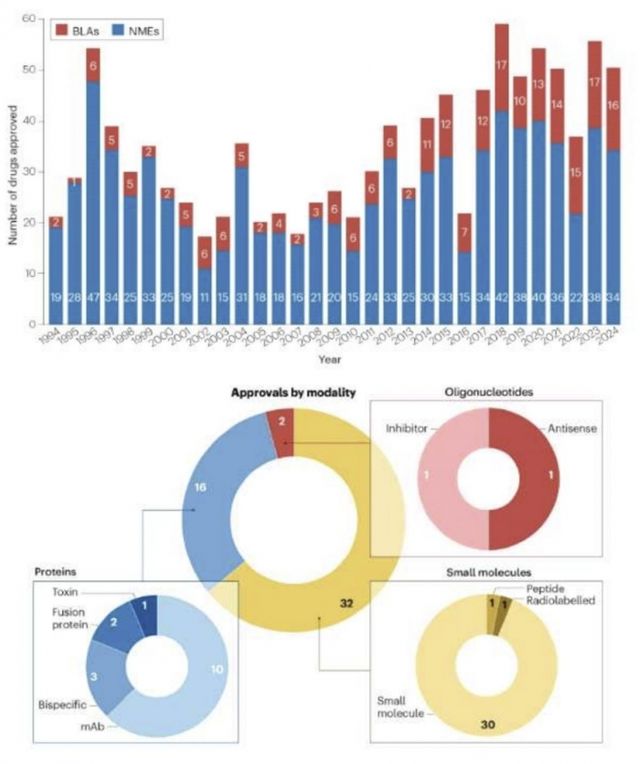 4일 국제학술지 네이처 리뷰 드럭 디스커버리와 한국바이오협회에 따르면, 지난 한 해 미국 FDA 의약품평가연구센터(CDER)는 저분자신약, 생물학적 제제 및 올리고뉴클레오타이드 등 총 50개 신약을 허가했다. 지난 30년(1994년~2023년)간 두 번째로 많이 승인된 해인 2023년(55개)보다는 약간 적었으나, 지난 10년간 연평균 승인 신약 건수인 46.5개 보다는 많은 수치다.