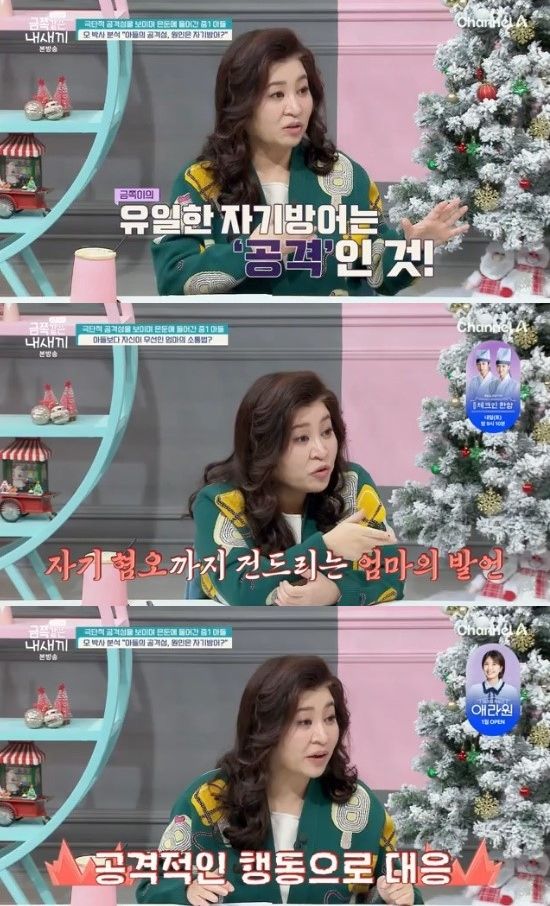 결국 제작진이 긴급 투입됐고, 금쪽이를 제지한 뒤에야 상황이 멈췄다. 이를 본 스튜디오의 신애라는 "너무 일촉즉발의 상황"이라며 안타까움을 금치 못했다.
