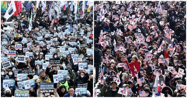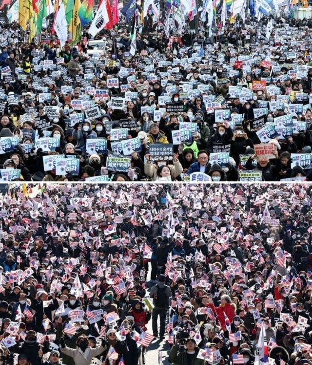 2025년 첫 주말인 4일 오후 서울 도심 광화문 일대에서는 윤석열 대통령 탄핵을 촉구하거나 반대하는 대규모 집회가 열렸다. 사진은 경복궁 동십자각 인근에서 열린 ‘윤석열 즉각퇴진-사회대개혁 비상행동 범시민대행진’(위)과 동화면세점 앞에서 열린 '윤석열 대통령 탄핵반대 국민대회'(아래). / 뉴스1
