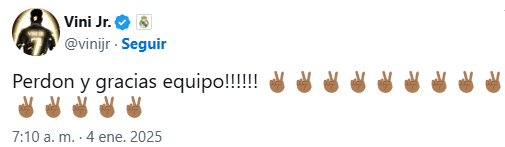 선수 본인은 큰 반성을 보이지 않고있다. 비니시우스는 경기 후 사진의 사회관계망서비스(SNS)를 통해 "미안하고 고마워"라는 글과 브이 이모티콘 여러개와 함께 게시글을 올렸다.