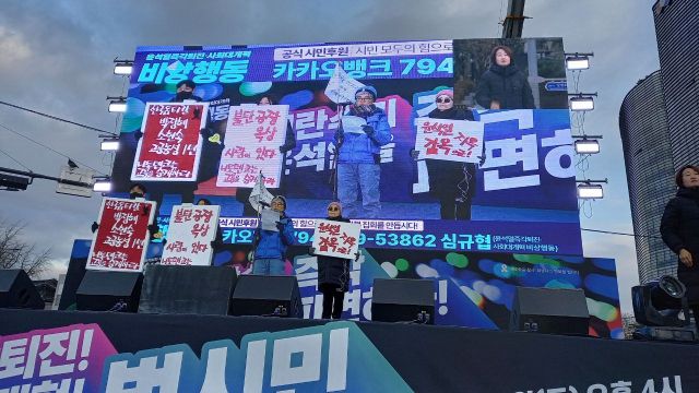 청각 장애인으로 인공와우를 끼고 소통하는 전수민 씨는 "청년·여성·노동자·성소수자·이주민·장애인 등 다양한 사람들이 '윤석열 탄핵'을 위해 모였다. 그런데 윤석열은 자신의 안위를 위해 계엄령을 발동함으로써 다양한 정체성을 가진 사람들의 일상을 깨려고 했다"며 "단순히 책임 물음에서 나아가 우리 모두가 갖고 있는 의제를 해결하는 세상을 이루자"고 했다.