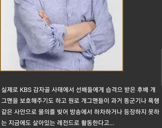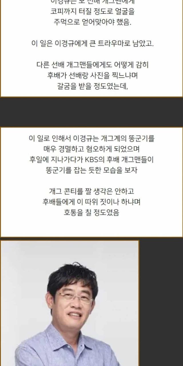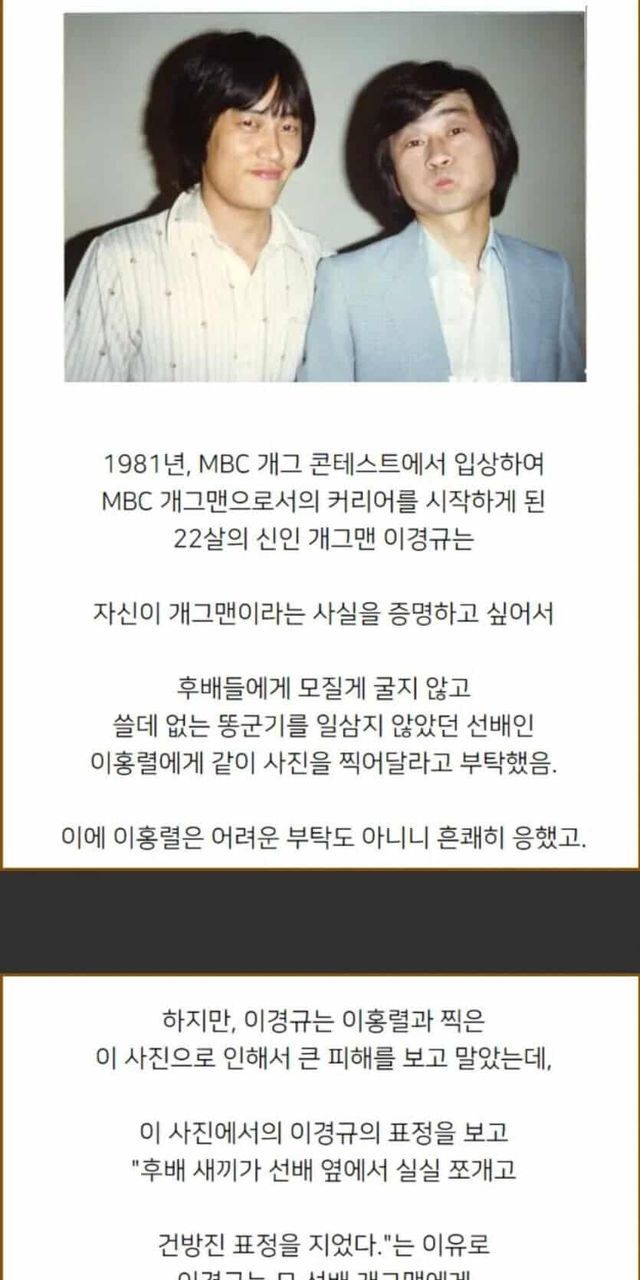 하다 못해 후배 개그맨조차 똥군기 논란이 있는 와중에 탑에 올랐던 원로 개그맨이 폭력이나 똥군기 같은 논란이 없어 지금까지 사랑을 받는다고…