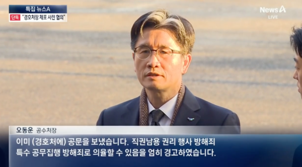 지난 1일 오동운 공수처장은 "대통령 경호처가 영장 집행을 방해할 경우, 직권남용과 공무집행방해 혐의로 사법 처리하겠다"고 강력히 경고했다.