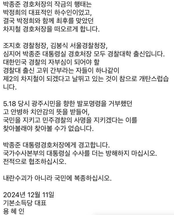 공수처는 박 처장을 특수공무집행방해 혐의로 입건하고 출석을 요구했으나, 박 처장은 “현재 경호 상황이 엄중하다”며 출석을 거부했다.
