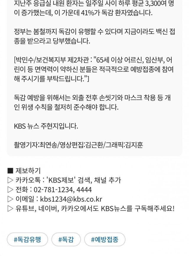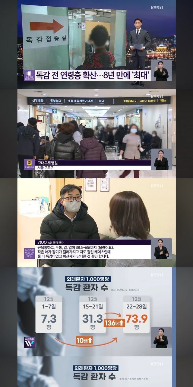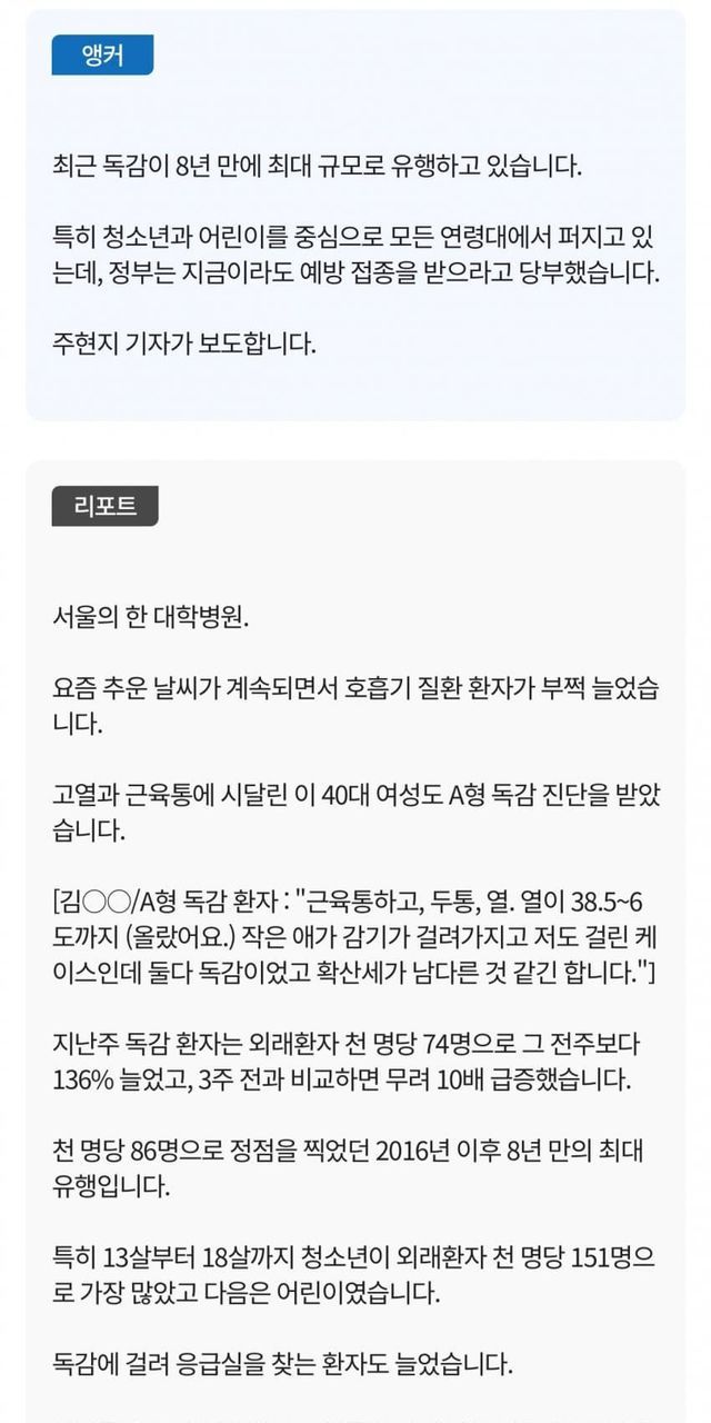 [앵커] 최근 독감이 8년 만에 최대 규모로 유행하고 있습니다. 특히 청소년과 어린이를 중심으로 모든 연령대에서 퍼지고 있는데, 정부는 지금이라도 예방 접종을 받으라고 당부했습니다. 주현지 기자가 보도합니다. [리포트] 서울의 한 대학병원. 요즘 추운 날씨가 계속되면서 호흡기 질...