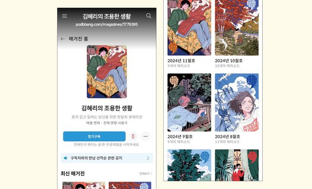 김혜리의 조용한 생활 podbbang.com/magazines/1779395 작업을 할 때 팟캐스트를 틀어놓는 편이다. 집중력이 분산되지 않느냐고 묻는다면, 개인적으로는 오히려 때때로 작업에 대한 새로운 영감을 얻기도 한다. 그런 지점에서 최근 알게 된 것이 오디오 매거진이라는 포맷이 가진 매력이다. ‘내가 어떤 이야기를 듣게 될지 알 수가 없다’는 점. 유튜브에서는 내가 필요한 정보들을 검색해 빠르게 얻을 수 있지만, 다양한 이야기가 혼합 구성된 오디오 매거진에서는 미처 나에게 필요한지 몰랐던 것까지 얻을 수 있다. 추천 채널은 영화평론가 김혜리의 ‘김혜리의 조용한 생활’이다. 청취가 끝난 후 사색에 잠길 여지를 매 호 꼭 하나씩은 남겨주는 것 같다. 최영훈(일러스트레이터, 만화가)