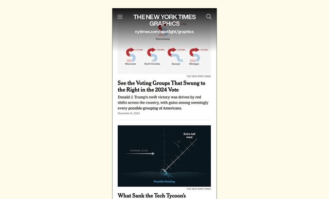 THE NEW YORK TIMES GRAPHICS nytimes.com/spotlight/graphics 〈뉴욕 타임스〉의 데이터 시각화 기사 채널. 단순히 원고 기사의 데이터를 재가공하는 수준에 그치는 게 아니라 디자이너, 통계학자, 공학자 같은 다양한 전문가들로 구성된 팀이 시각화해 전달했을 때 효과적인 뉴스를 즉각적으로 제작해 전달한다. 그러니 채널을 처음 알게 됐을 때는 얼마나 놀랐는지 모른다. 비주얼 저널리즘의 새로운 가능성을 보여주는 것처럼 보였으니까. 물론 지금은 많은 매체가 비슷한 플랫폼을 만든 상태지만 개인적으로 여전히 〈뉴욕 타임스〉 그래픽스를 챙겨 보고 있다. 빠르고, 정확하며, 직관적이고, 심지어 아름답다. 기사 하나하나 즐겁고 솔직히 부럽기도 하다. 전가경(디자인 저술가, 출판사 사월의눈 대표)