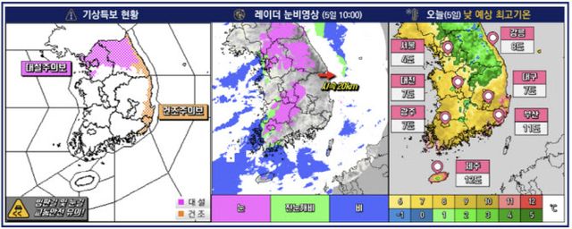 한편 동해안을 중심으로는 대기가 매우 건조한 상황이 유지될 전망이다. 이날 오전 10시 기준 강원도 속초와 강릉 등 동해안 지역에는 건조주의보가 발표됐다. 이에 대해 기상청 관계자는 “건조특보가 발효된 강원동해안과 강원남부산지, 경북동해안, 일부 경남권은 대기가 매우 건조하겠고, 그 밖의 경상권도 대기가 건조하겠다”며 “바람도 강하게 불면서 작은 불씨가 큰불로 번질 수 있겠으니, 산불을 포함한 각종 화재 예방에 각별히 유의하기 바란다”고 했다.
