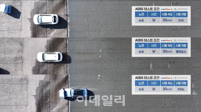 TS는 AEBS에 대한 첫번째 시험조건은 낮시간 시속 40㎞의 속도로 아스팔트를 주행했다. 주행 차량은 EV6(기아), 그랑 콜레오스(르노), 530e(BMW)이다.