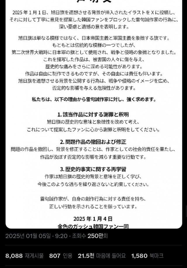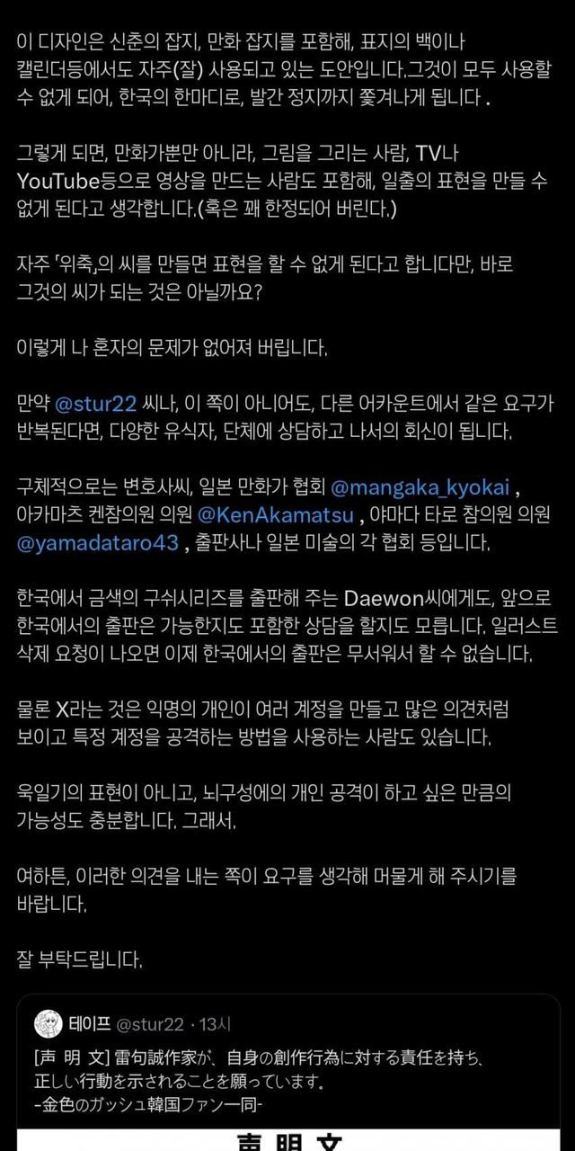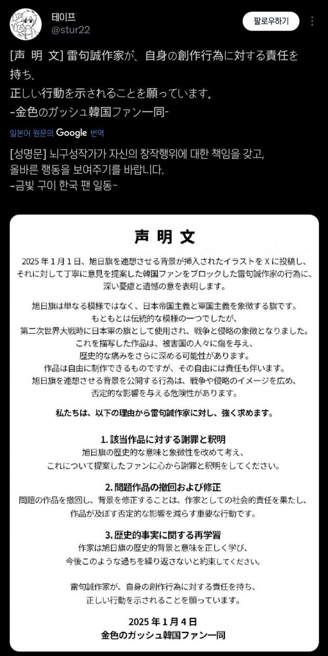 한국 팬 일동(이라 주장)하는 사람이 욱일기쓰지말고 사과하라고 성명문을 냄