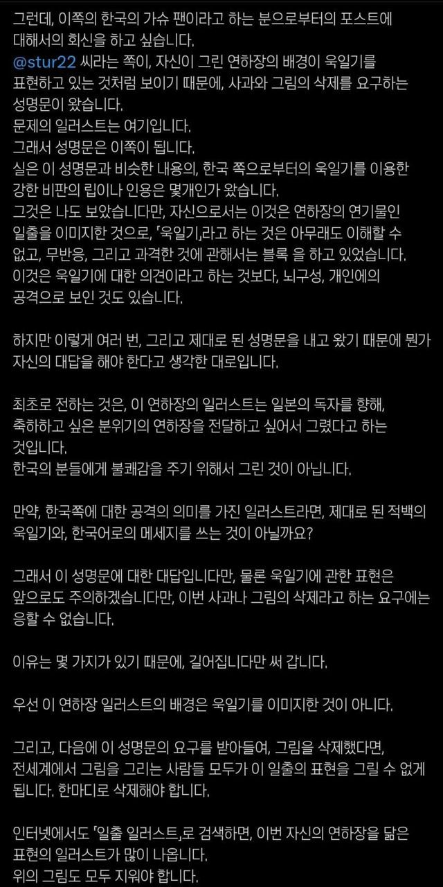 요약) 욱일기라고 하는 것이 이해가 되지 않아서 무반응, 블록으로 대응해왔지만 여러번 제대로된 성명문을 냈으니 대답을 해야겠다고 생각했음