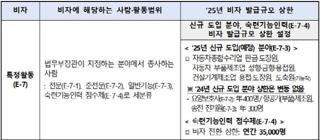 5일 법무부에 따르면 올해 새롭게 시범 도입되는 분야는 건설기계제조업 용접·도장원, 자동차부품제조업 성형·용접·금형원, 자동차종합수리업 판금·도장원, 도축원 등 4개 영역이다. 이들 분야의 기능인력(E-7-3) 비자 발급 상한은 추후 확정될 예정이다.