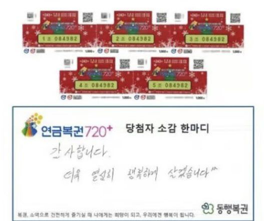 한편 연금 복권은 1세트당 5장으로 판매하며 모든 조를 같은 번호로 구매해 당첨 시 1등과 2등에 동시 당첨되는 방식이다. 1등은 20년간 매월 700만 원씩, 2등은 10년간 매월 100만 원씩 연금 형식으로 당첨금을 받는다.