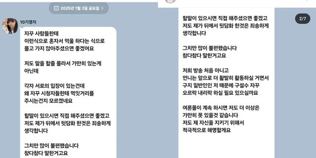 이에 따르면 영자는 정숙에게 "자꾸 사람들한테 혼자서 억울하다는 식으로 몰고 가지 않았으면 좋겠다. 각자 서로의 입장이 있는 건데 왜 자꾸 시청자들한테 먹잇거리를 주시는 건지 모르겠다"고 장문의 글을 남겼다.