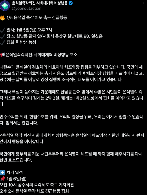 주최 측은 윤 대통령 체포영장 시한이 다가오는 만큼 긴급 행동을 이어갈 계획이다. 오는 1월 6일에는 오전 10시 공수처 앞에서 "윤석열 즉각 체포"를 촉구하는 기자회견이 예정돼 있으며, 오후 2시에도 한남동 관저 앞에서 긴급 집회가 열릴 예정이다.