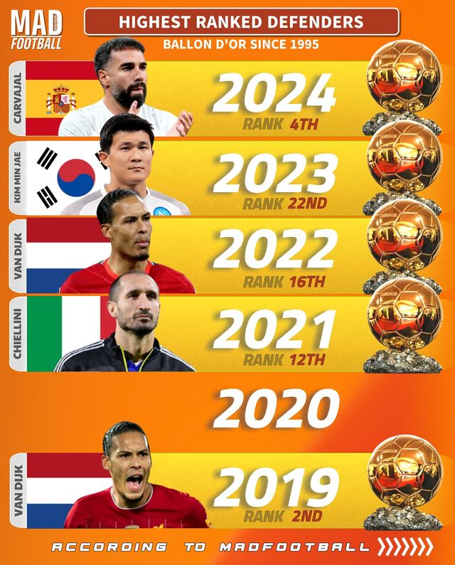 2021년에는 이탈리아의 조르조 키엘리니가 12위, 2022년에는 판 데이크가 16위를 차지했고, 2023년에 대한민국 김민재가 22위를 차지하며 수비수 중 가장 높은 순위에 오른 선수로 역사에 이름을 새겼다. 지금까지 목록을 보면 알 수 있듯, 아시아 선수로는 최초다. 지난해에는 스페인 다니 카르바할이 4위에 올랐다.
