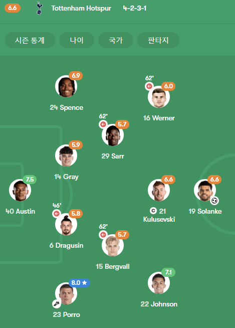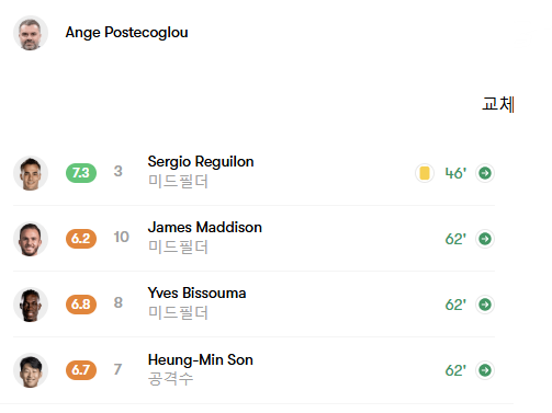 이번 뉴캐슬 전 토트넘은 손흥민을 포함해 메디슨, 레길론, 비수마까지 총 4장의 교체카드를 사용했다. 손흥민은 메디슨(6.2) 다음으로 교체 투입 선수 중 가장 낮은 평점을 받았다. 가장 높은 평점은 7.3의 레길론이었다.