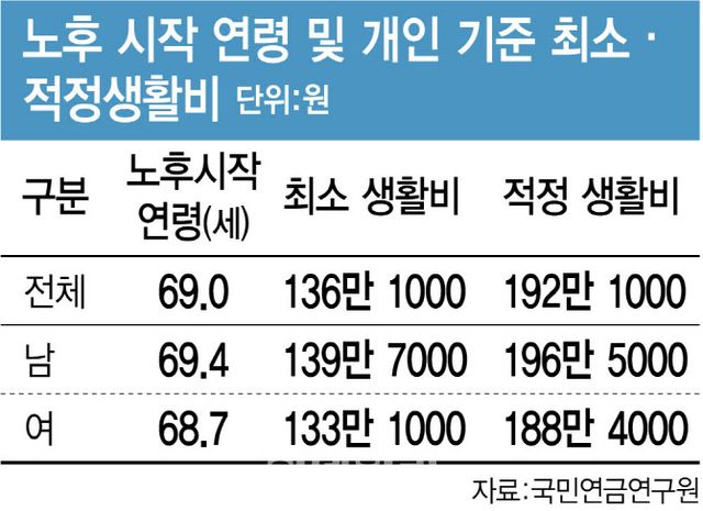 실제로 국민연금공단의 ‘2023년 제10차 국민노후보장패널조사 결과’에 따르면 우리나라 50대 이상 중고령자가 스스로 노인이 됐다고 생각하는 시점은 69세였다. 생계를 목적으로 근로 및 소득 활동을 더는 하지 않고 일자리도 찾지 않는 은퇴 시점은 67세로 2년 더 빨랐지만, 실제 퇴직연령은 50대 중반이라는 것을 감안하면 10년 이상 더 일할 수 있다는 것을 의미한다. 이들이 생각하는 노후 최저 생활비는 136만원, 적정생활비는 월 192만원으로 나타났다.