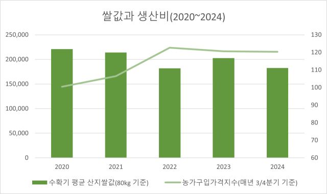 쌀값은 단순히 수요와 공급으로 결정되지 않는다. 2024년만 해도 폭염과 폭우, 이상고온 피해가 있어서 쌀 수확량이 줄었는데도 쌀값은 하락했다. 통상 7월부터 9월 사이에는 산지 쌀값이 오르는데, 2024년의 경우 8월 초에 17만 원대(80kg 기준)까지 떨어졌다. 통계청 국가포털에 게시된 2024년산 11월 5일자 산지 쌀값은 18만2700원. 2023년 수확기 평균 산지 쌀값 20만2797원보다 낮다. 1만 원으로 비빔밥 한 그릇도 사 먹지 못하게 된 지 오래인데 쌀값은 오히려 내려갔다.