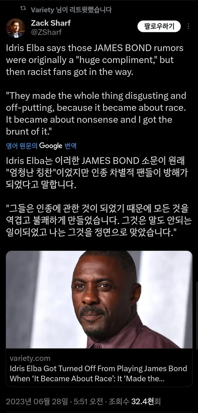 가만히 있던 이드리스 엘바가 악플에 시달려서